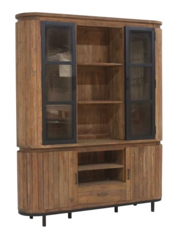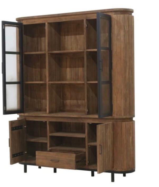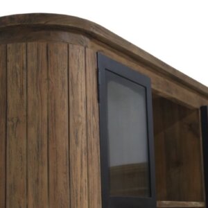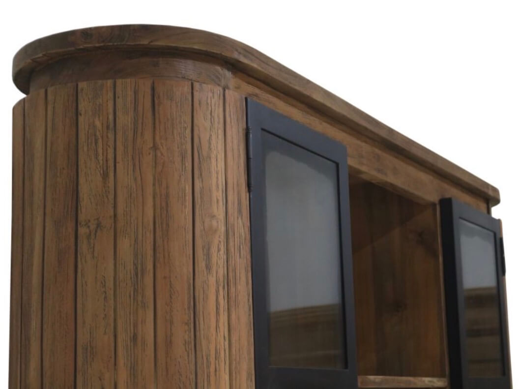 Prachtige teakhouten kast met ijzeren deuren. De kast bestaat uit een onder en een bovenkast. De zijkante zijn rond gemaakt van massieve teakhouten latten.